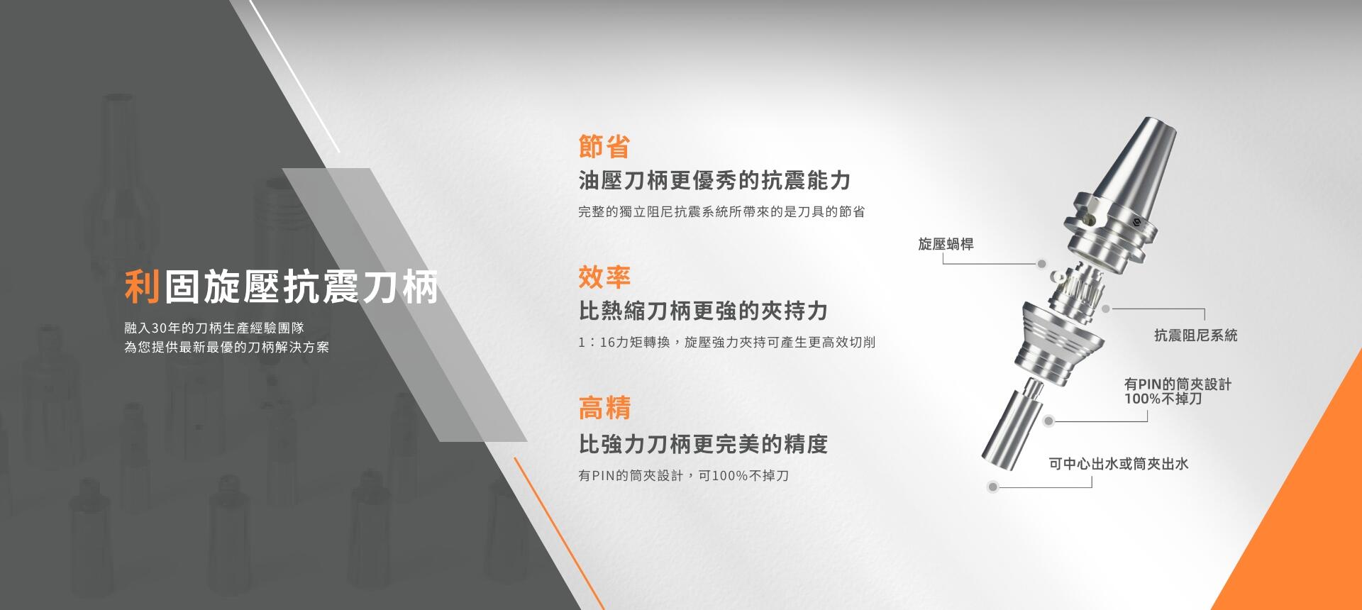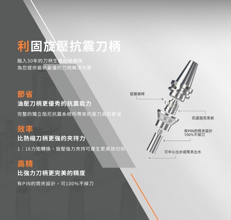 利固精工精密公司拥有30年刀柄生产技术研发团队,历经三年的时间研发测试调整,创新突破开发出《利固旋压刀柄》,获台湾及大陆专利,具有高精密、高效率、高稳定、高可靠度、节省成本等高性价比优势,提供产业界最新、最优的刀柄解决方案,有效协助产业界提升整体竞争力。
